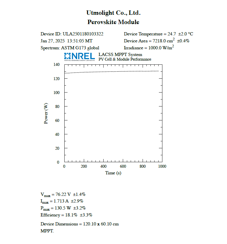值得关注的是,极电光能始终以稳效协同的“产品力”为目标、以“交付能力”为导向。早在2023年11月,组件便已通过IEC 61215/61730全套稳定性测试认证,功率达到95W(全面积效率13.2%)。在2024年11月,又将通过IEC 61215/61730认证的组件功率提升到120W(全面积效率16.7%),成为全球通过IEC稳定性测试认证效率最高的组件。而此次稳态效率(MPPT)跃升至18.1%,更验证了极电光能钙钛矿量产工艺的持续优化能力——从膜层缺陷率降低到良品率提升,从工艺参数优化到设备适配升级,每一步都锚定产业化落地的实际需求。